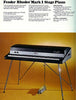 The Fender Rhodes Mark I Stage 73 is a 73-key electric piano first manufactured in 1970 as a lighter version of the "suitcase" model. It features a sustain pedal and a single mono output jack. It's distinctive sound is produced by hammers striking metal 'tines' which are then amplified via a pickup.